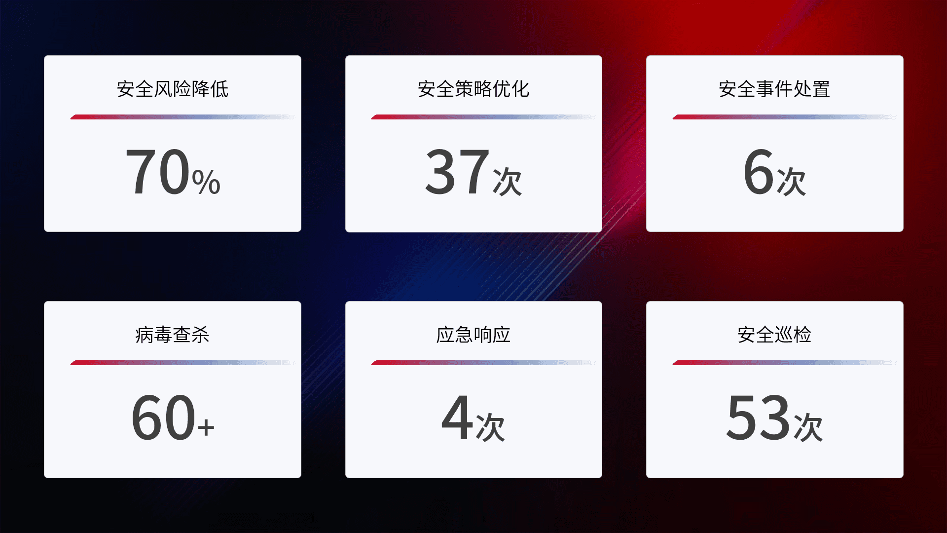 提供全面的安全事件报告体系,,包括处置报告、、、周报、、、季度和年度总结,,,,结合持续监控,,,帮助客户深入了解网络安全状况。。。