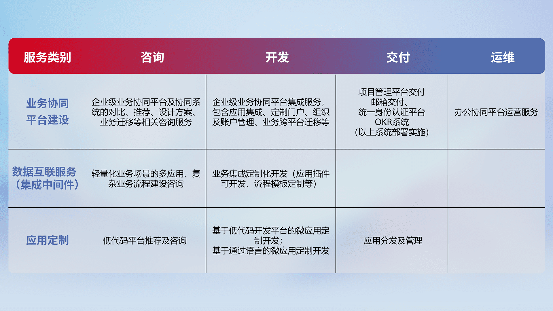 针对钉钉、、、企微、、、IDaas等平台级产品提供产品的规划、、方案、、、交付、、、定制化开发等服务,,实现如统一协同办公、、、智能客户服务、、、、混合会议管理、、、智能数据查询、、、、等业务场景,,实现数字化转型。。。。